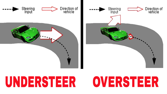 UNDERSTEER - SUBVIRADOR El subviraje, se refiere al comportamiento de un vehículo que tiende a ensanchar la trayectoria de desplazamiento en curva, obligando al conductor a realizar maniobras de corrección (aumento de la dirección o en caso de bloqueo de frenada, soltar el freno y realinear para una dirección instantánea) para permanecer en la trayectoria deseada. |